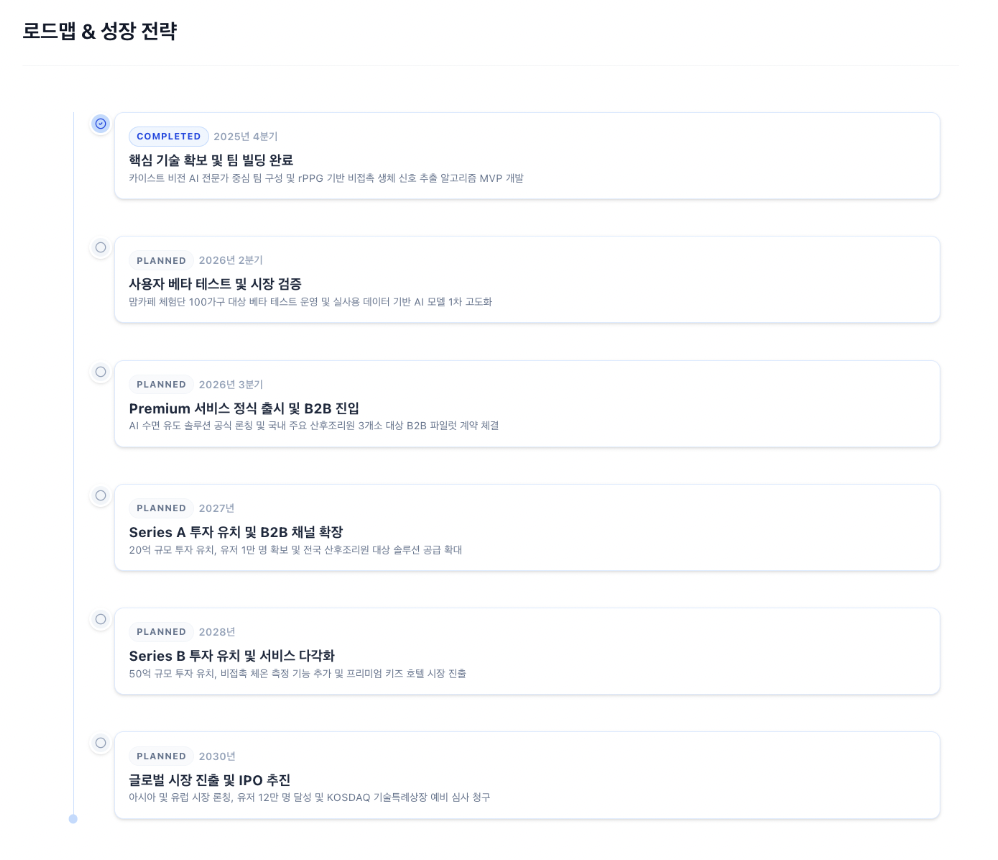각 단계별 정량적 목표(매출액, 유저 수, 인증 획득 등)를 병기하는 것이 핵심입니다.