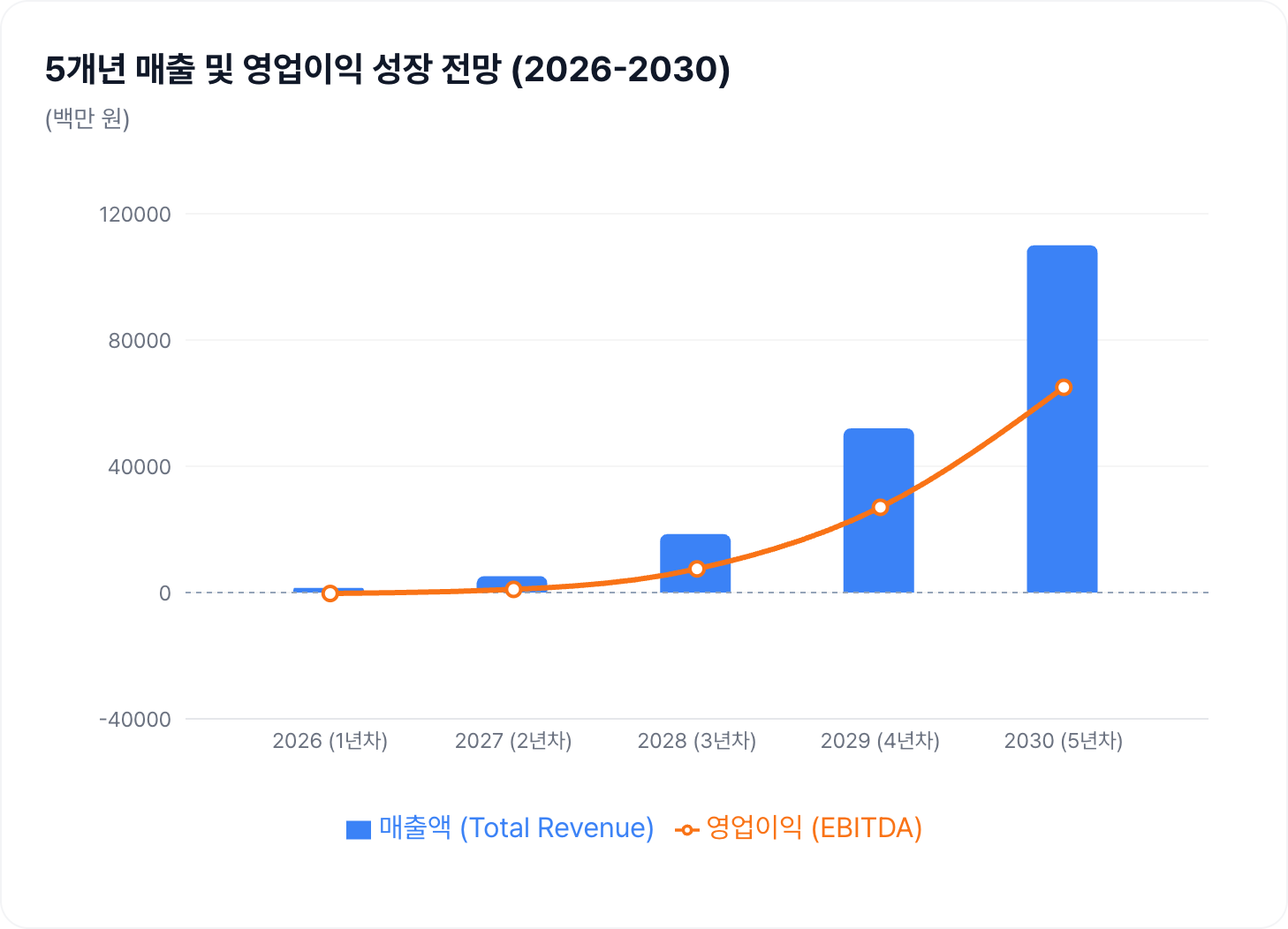 • Step 2 (Seed / Pre-A): 2026년 상반기, 확보된 유닛 이코노믹스(LTV/CAC 4.5x)를 근거로 10억~15억 원 규모의 투자 유치 추진. (팁: 메이크덱이 생성한 매출 추정 차트를 IR 자료로 활용)