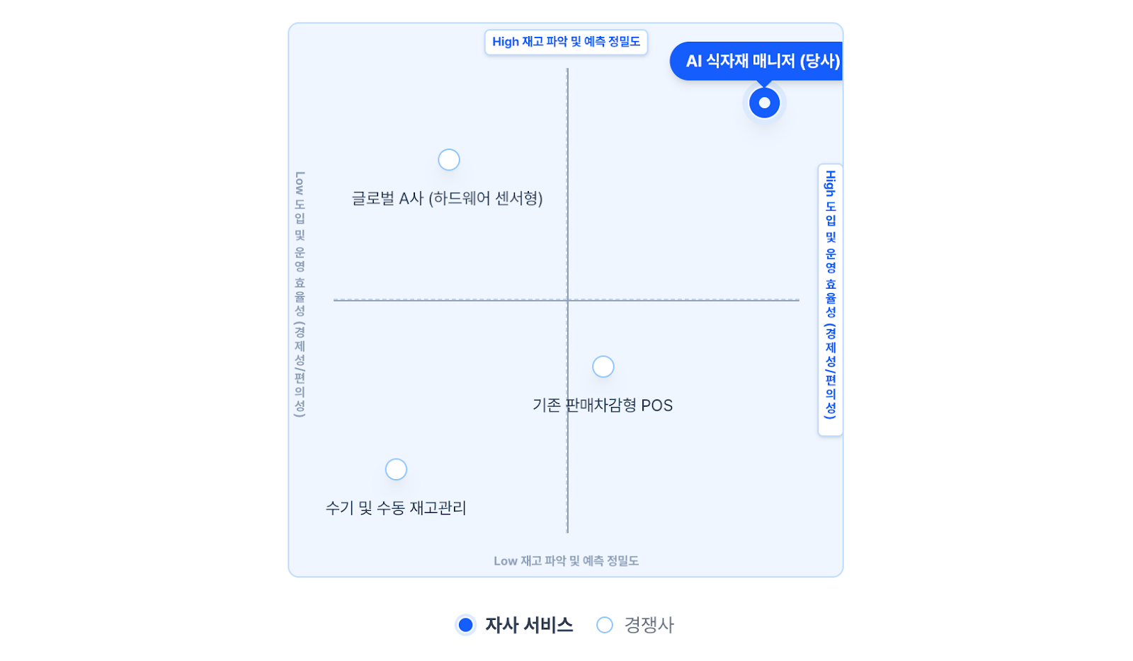 당사의 솔루션은 기존 POS의 '사후 기록' 방식과 글로벌 경쟁사의 '고가 하드웨어(저울형 센서)' 방식의 단점을 동시에 해결합니다.
