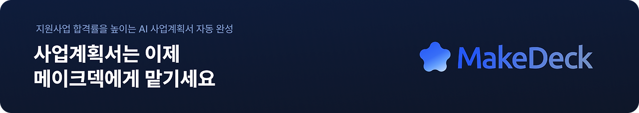 단순한 텍스트 생성을 넘어 도식화부터 양식 최적화까지, 메이크덱은 대표님이 서류 작업이 아닌 비즈니스 본질에만 집중할 수 있도록 돕습니다. 내 사업 아이디어를 현실로 바꿀 확실한 타이밍, 지금 메이크덱과 함께 합격의 주인공이 되어보세요!