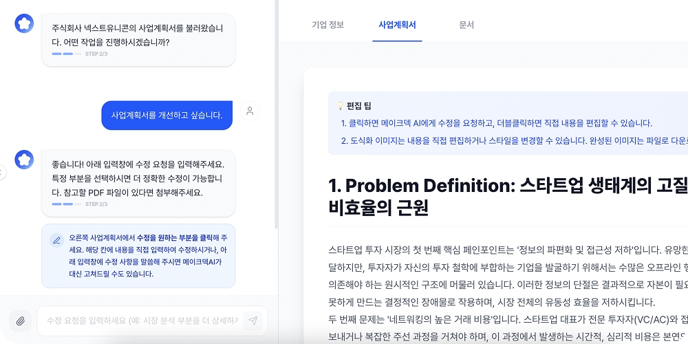 빠르게 생성된 초안을 기반으로 메이크덱 AI와 실시간으로 피드백을 주고받으며, 밤샘 작업 없이도 정교한 사업계획서를 완성할 수 있습니다.