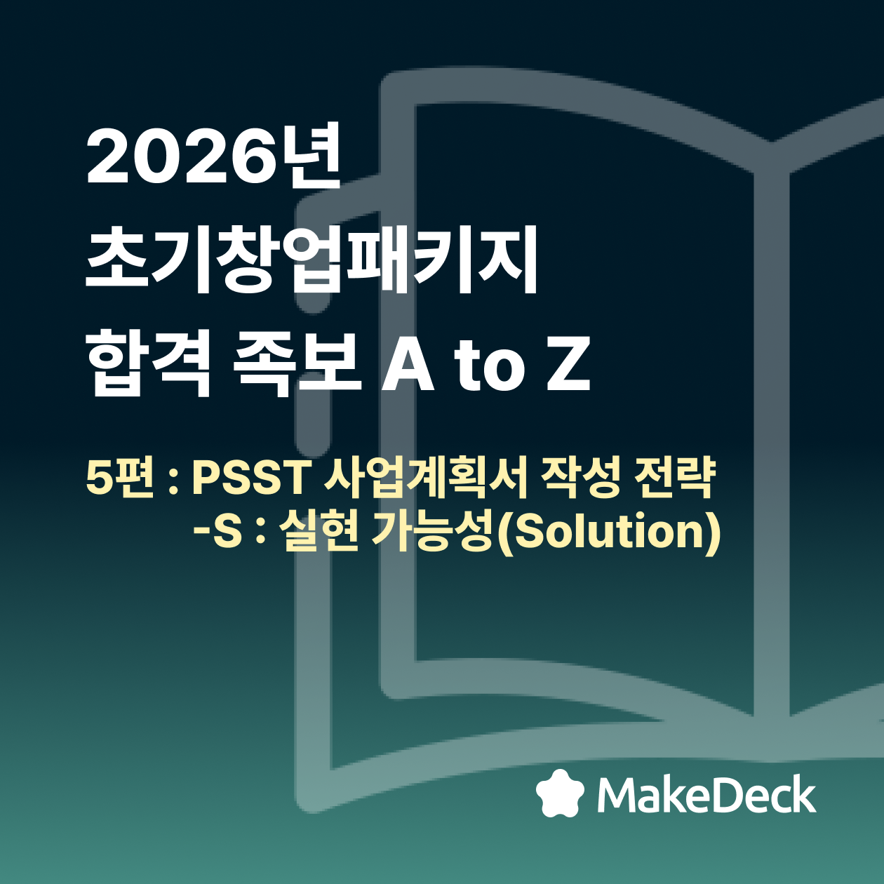 안녕하세요! 정부지원사업 합격을 위한 사업계획서 작성 1등 AI 솔루션, 메이크덱(MakeDeck)을 만들고 있는 메이크덱 팀입니다. 지난 콘텐츠에서는 합격하는 사업계획서 작성의 첫 단추이자심사위원에게 가장 강력한 인상을 남겨야 하는 Problem(문제 인식) 파트를 상세하게 다뤄보았습니다. 이번 콘텐츠에서는 초기창업패키지 합격의 두 번째 관문이자, 아이템의 실체를 증명하고 기술적 우위를 점해야 하는 PSST의 S(Solution, 실현 가능성) 파트를 다룹니다. 심사위원은 앞서 제시된 '날카로운 문제'를 확인한 후, 과연 이 팀이 이걸 진짜 만들 실력이 있는가?를 검증합니다.특히 PSST 파트는 메이크덱을 활용하면 심사위원을 단번에 설득하는 상위 3% 수준의 압도적인 사업계획서를 완성할 수 있습니다...